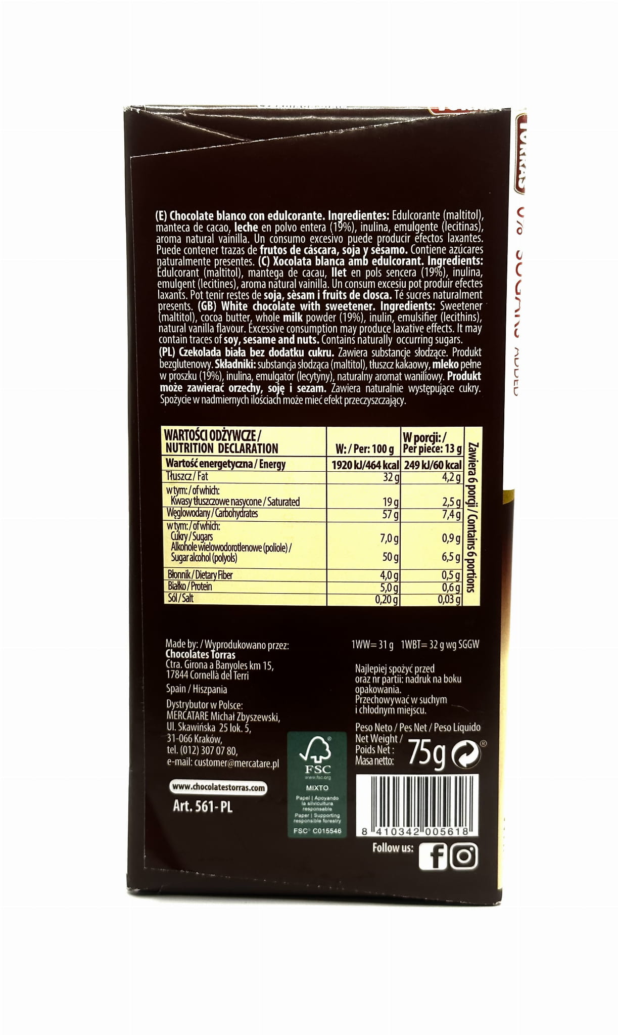CZEKOLADA BIAŁA TORRAS 75G