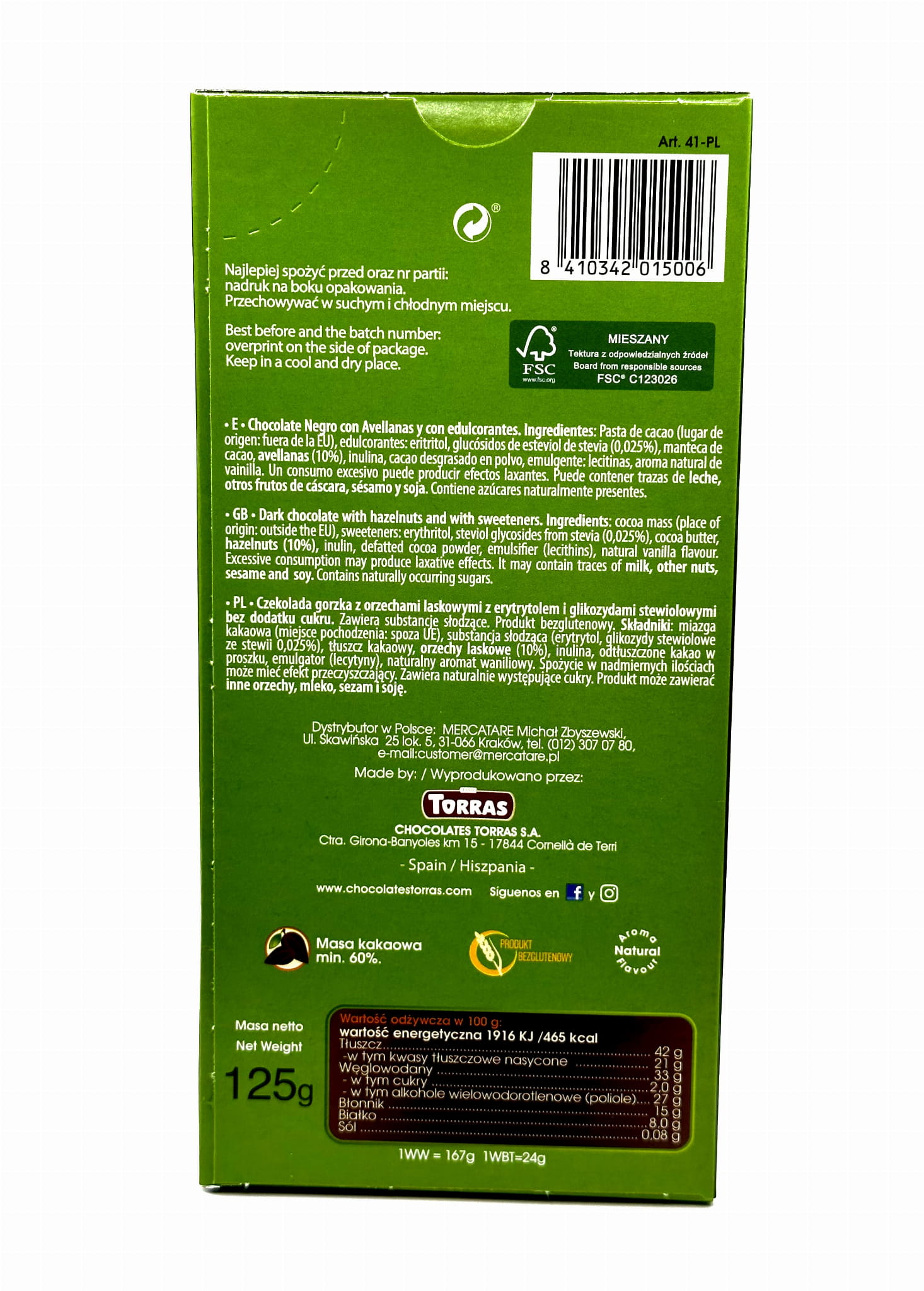 CZEKOLADA GORZKA Z ORZECHAMI LASKOWYMI 125G TORRAS