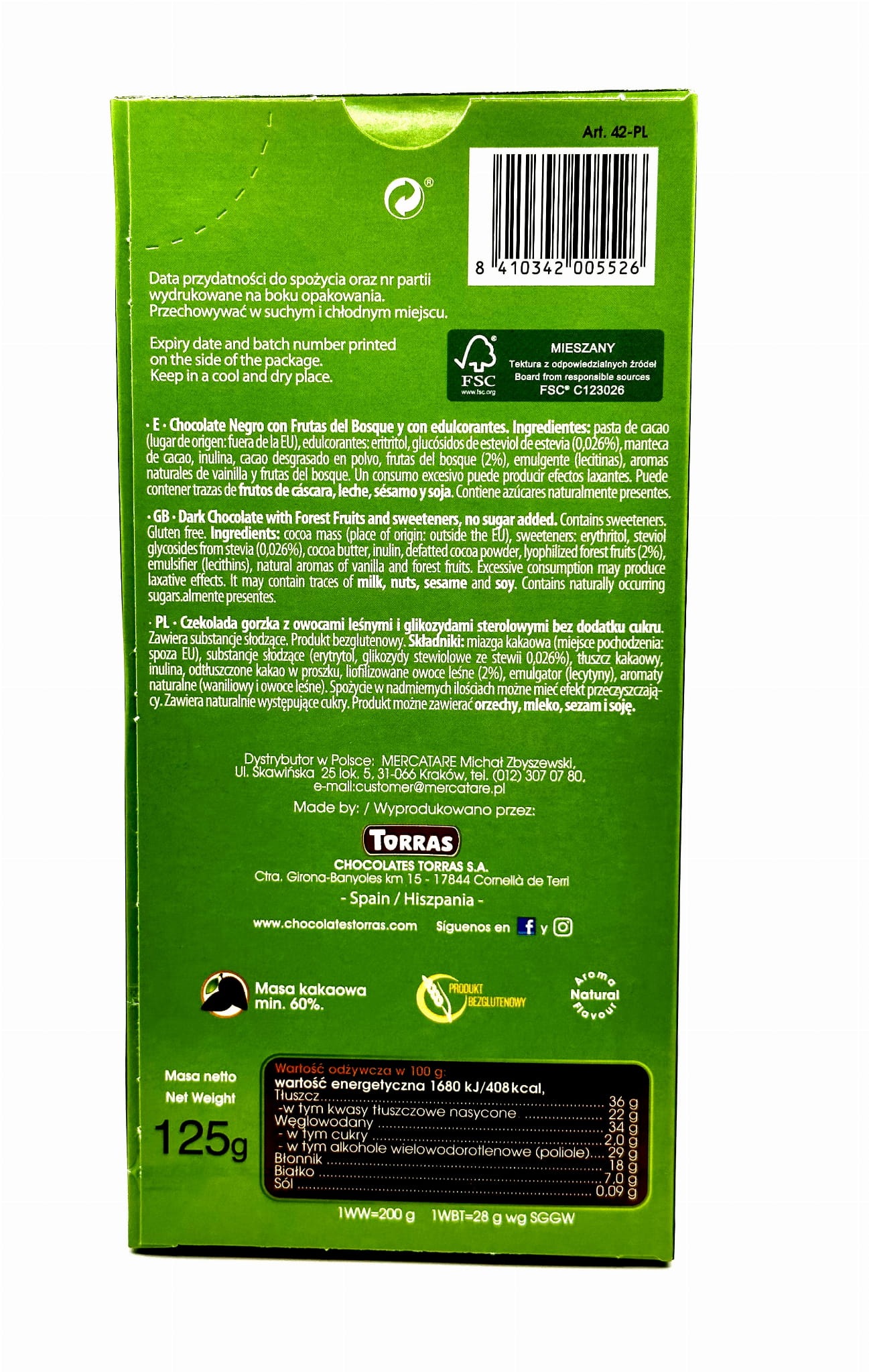 CZEKOLADA GORZKA Z OWOCAMI LEŚNYMI 125G TORRAS