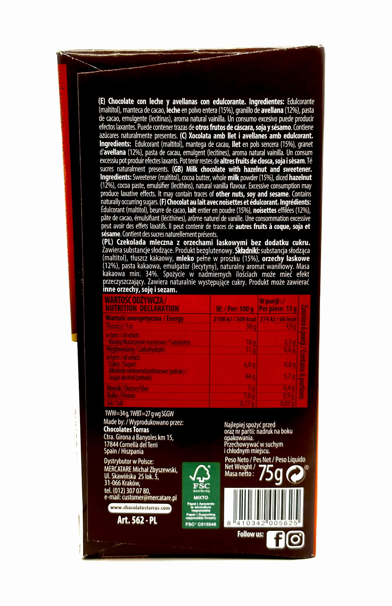 CZEKOLADA MLECZNA Z ORZECHAMI LASKOWYMI 75G TORRAS