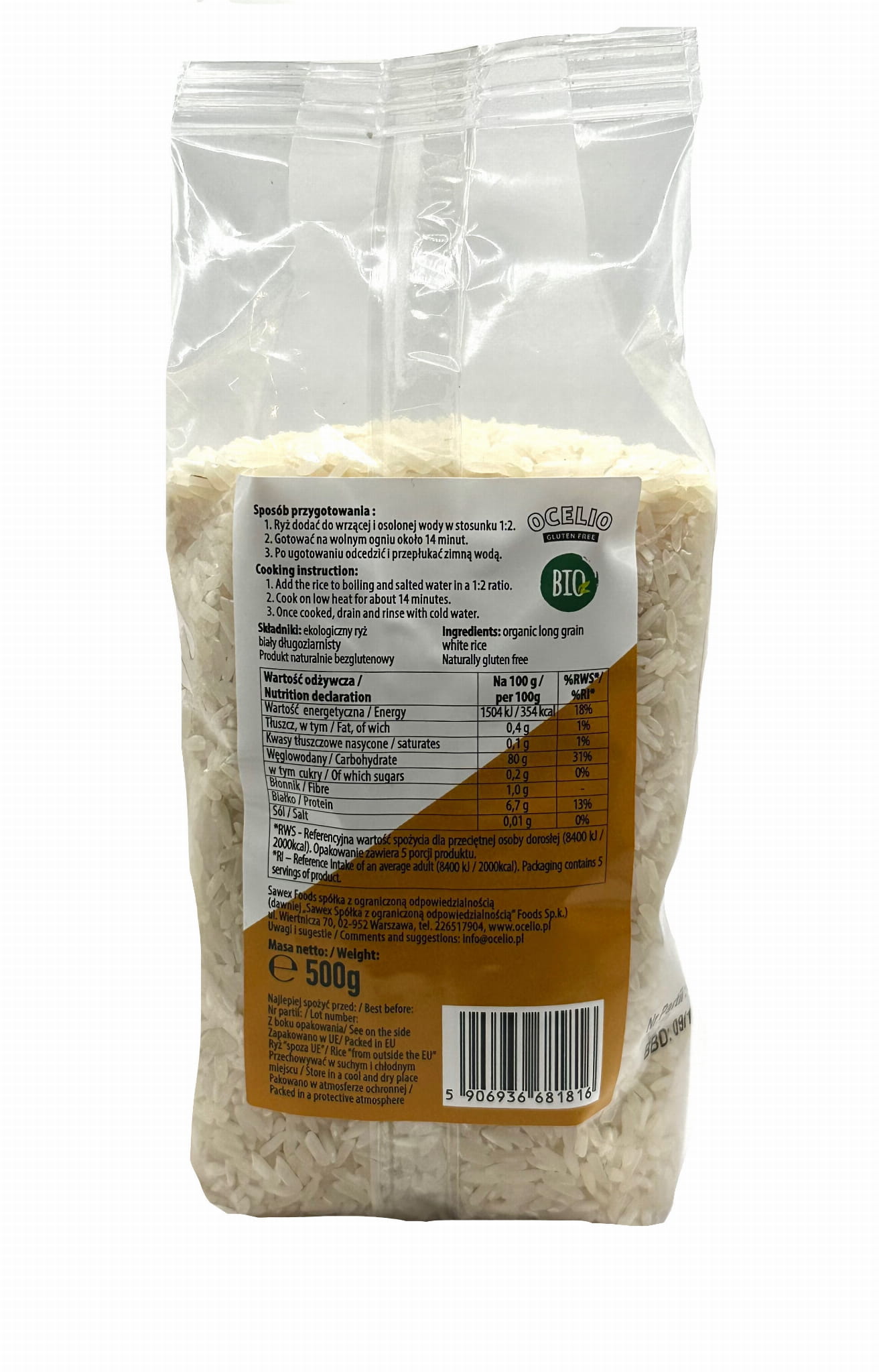 RYŻ BIAŁY DŁUGOZIARNISTY BIO 500G OCELIO